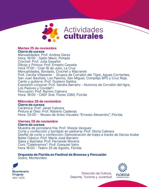 La Dirección General de Cultura difundió el cronograma de actividades que se desarrollarán entre el 25 y el 30 de noviembre, con cierres de cursos y eventos artísticos en distintas localidades del departamento y en ciudades del país. La agenda incluye muestras, presentaciones, festivales y celebraciones con la participación de docentes, alumnos y agrupaciones culturales de Florida.