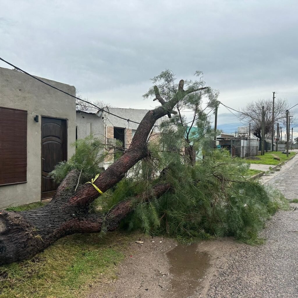 En la tarde-noche del pasado domingo, un árbol de gran porte cayó frente a la puerta de la vivienda de Eduardo Falero, ubicada en la esquina de Lorenzo D’Auria con Mendoza y Durán, frente a la vía férrea de la ciudad de Florida. La caída arrancó cables del tendido eléctrico, bloqueando la entrada y dejando al propietario y a su mascota temporalmente atrapados hasta la llegada de los bomberos y los equipos de electricidad.