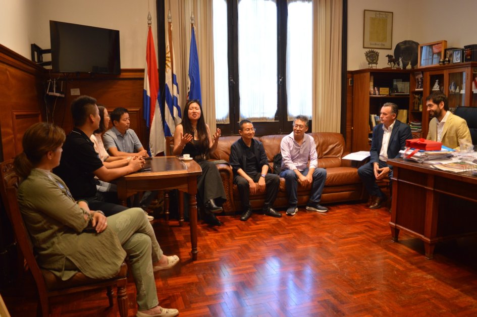 El secretario general de la Intendencia de Florida, José Luis Curbelo, junto al director de Desarrollo Sostenible, Arturo Torres, recibieron a una delegación de inversores chinos interesada en explorar proyectos de energía fotovoltaica en el departamento.