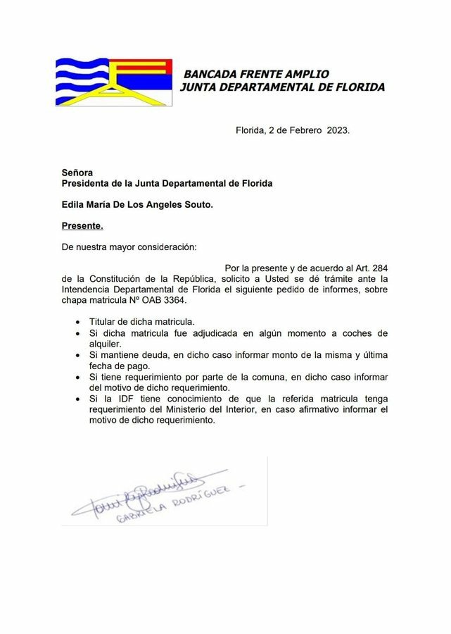 La edil del MPP, Gabriela Rodríguez brinda pidió de informe a la Intendencia de Florida, sobre la matrícula OAB 3364, retenida en Montevideo tras protagonizar un incidente que tuvo como protagonista a una militante del Partido Nacional.