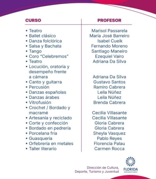 En el área artística se dictarán cursos de Teatro, Ballet clásico, Danza folclórica, Salsa y Bachata, Tango, Coro “Celebremos”, Locución, oratoria y desempeño frente a cámara, Canto y guitarra, Percusión, Danzas españolas y Danzas árabes.