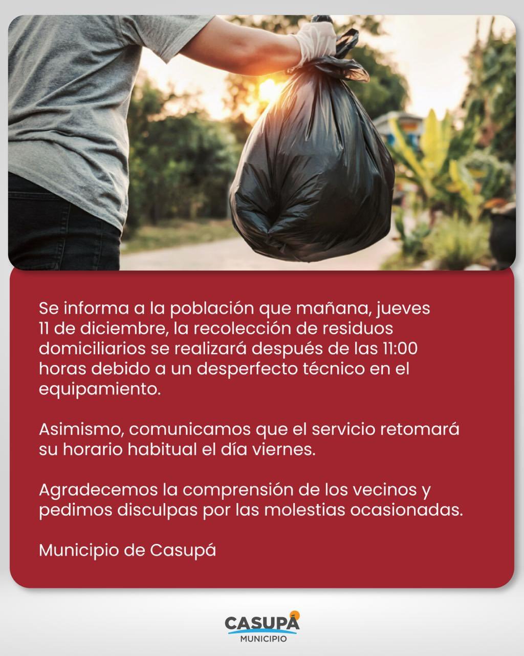El Municipio de Casupá informó a la población que este jueves 11 de diciembre la recolección de residuos domiciliarios se realizará después de las 11:00 horas, debido a un desperfecto técnico registrado en el equipamiento utilizado para el servicio.
