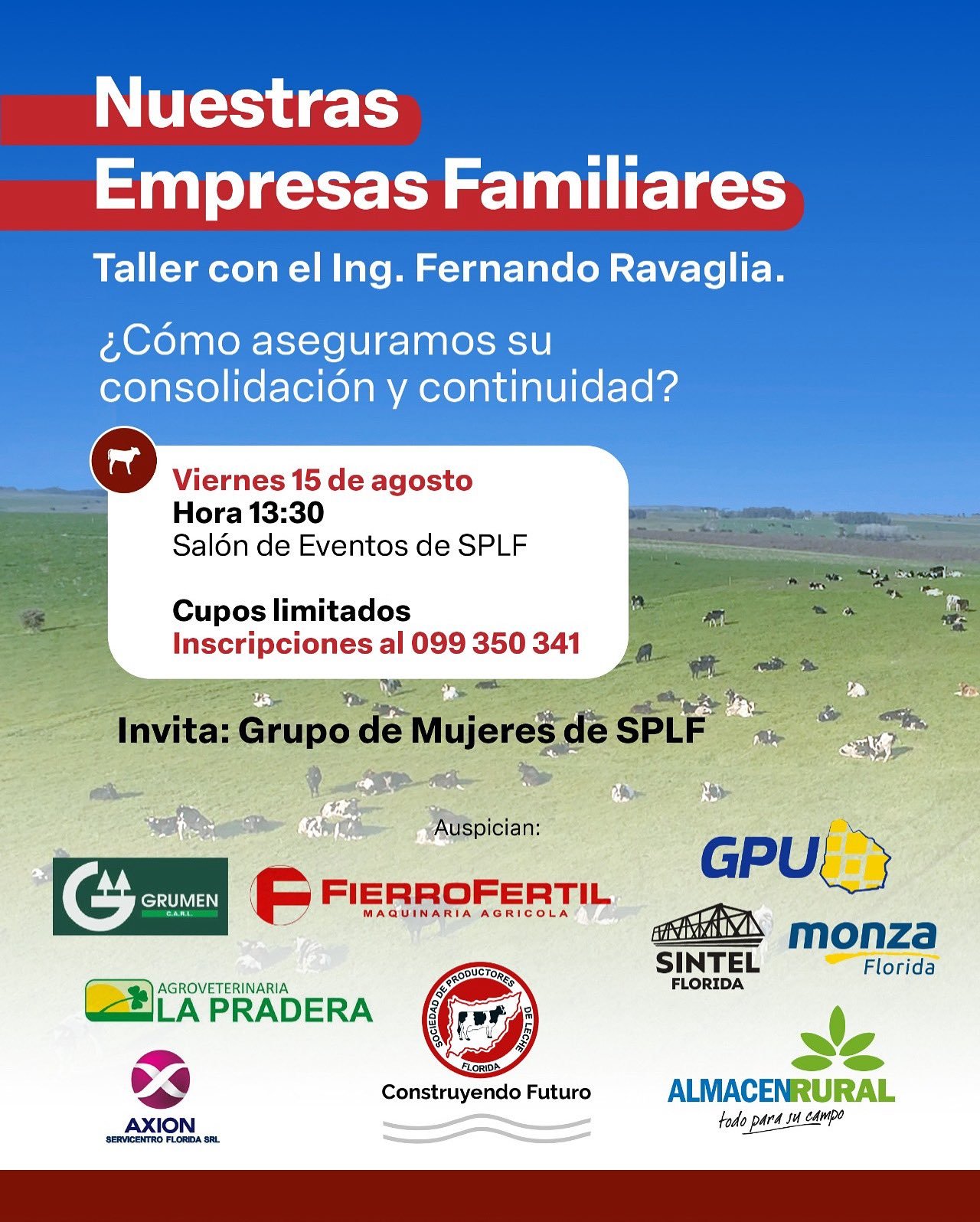El Grupo de Mujeres de la Sociedad de Productores de Leche de Florida (SPLF) convocó a productores, familias y actores vinculados al sector a participar de un taller titulado “Nuestras Empresas Familiares: ¿Cómo aseguramos su consolidación y continuidad?”. La actividad estará a cargo del ingeniero Fernando Ravaglia y busca aportar herramientas prácticas para fortalecer la gestión y la proyección de las empresas familiares en el rubro.