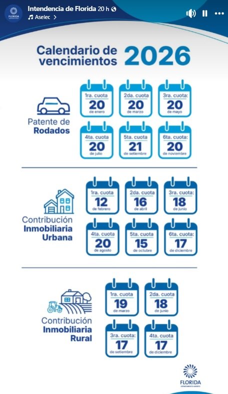 La Intendencia de Florida dio a conocer el calendario de vencimientos de los tributos departamentales correspondiente al año 2026, que incluye las fechas de pago de la Patente de Rodados, la Contribución Inmobiliaria Urbana y la Contribución Inmobiliaria Rural.