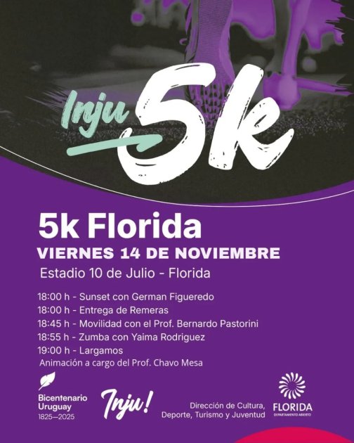 Hoy viernes 14 de noviembre se realizará en Florida una nueva edición de la tradicional 5K del Instituto Nacional de la Juventud (INJU), bajo el lema Con oportunidades las juventudes pisamos fuerte.