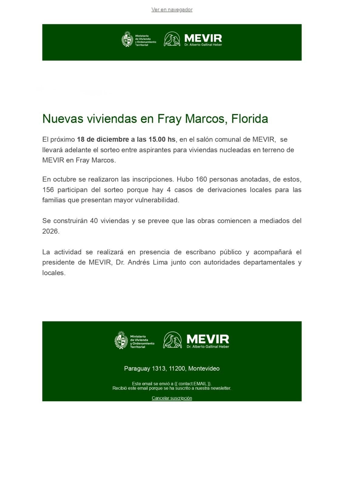 Un día que quedará marcado en la historia reciente de Fray Marcos. La comunidad vivió una jornada cargada de expectativa y emoción con la realización del sorteo de viviendas nucleadas en terreno de MEVIR, un paso fundamental para decenas de familias que sueñan con el acceso a su hogar propio.