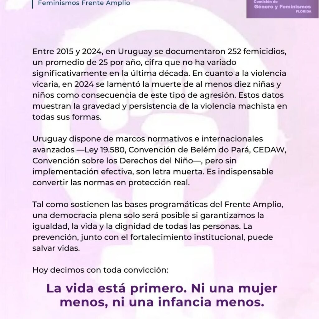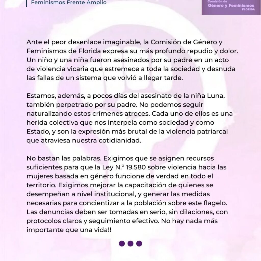 La Comisión de Género y Feminismos del Frente Amplio Florida emitió este 5 de setiembre una declaración pública en la que expresó su más profundo repudio y dolor por el asesinato de un niño y una niña a manos de su padre, en lo que definieron como un acto de violencia vicaria que sacude a toda la sociedad.