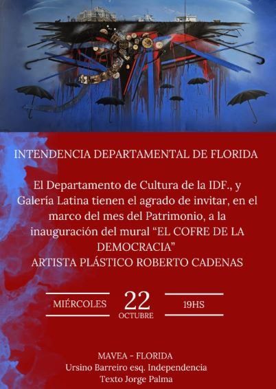 En el marco del Mes del Patrimonio, la Dirección General de Cultura de la Intendencia de Florida y la Galería Latina invitan a la inauguración del mural “El Cofre de la Democracia”, una creación del artista plástico Roberto Cadenas.