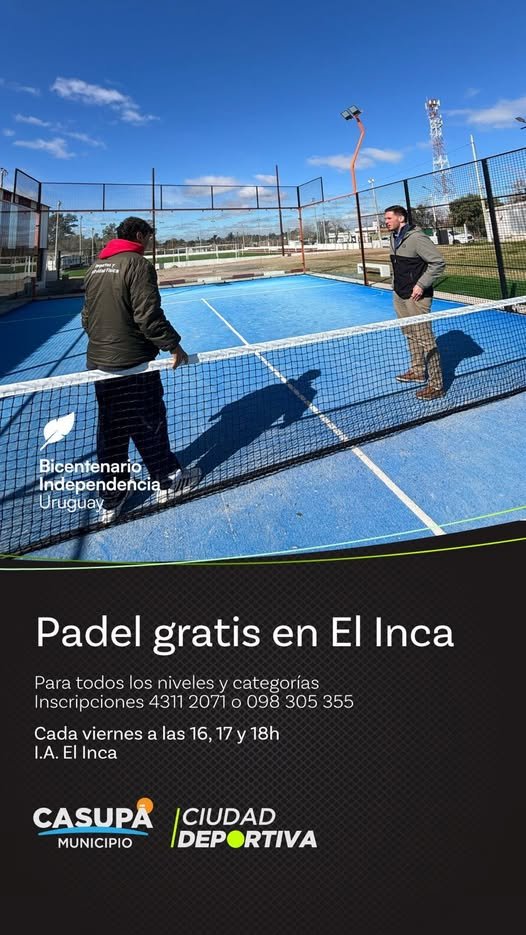 El Complejo INCA, con el respaldo del Municipio de Casupá y la Dirección de Deportes, puso en marcha una nueva propuesta deportiva: clases gratuitas de pádel para todos los niveles y categorías. La actividad, a cargo del instructor Richard Amaro, se desarrolla todos los viernes en la cancha de pádel del complejo, con horarios a las 16:00, 17:00 y 18:00 horas.