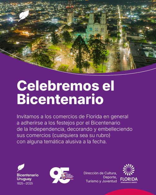 En el marco del programa conmemorativo “Agosto, Mes del Bicentenario”, la Dirección General de Cultura de la Intendencia de Florida y el Centro Comercial e Industrial de Florida convocan a todos los comercios del departamento a participar activamente de los festejos por los 200 años de la Declaratoria de la Independencia Nacional.