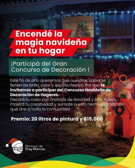 El Municipio de Fray Marcos anunció una nueva iniciativa impulsada por el Concejo Municipal para celebrar el cierre del año, invitando a toda la comunidad a participar del Concurso de Decoración de Hogares.