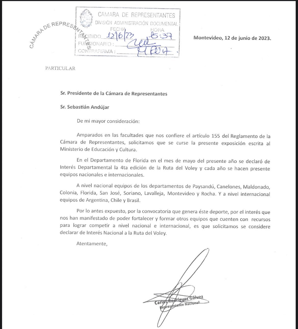 El diputado Carlos Rodríguez Gálvez presentó una exposición escrita para solicitar que se considere de Interés Nacional la Ruta del Voley