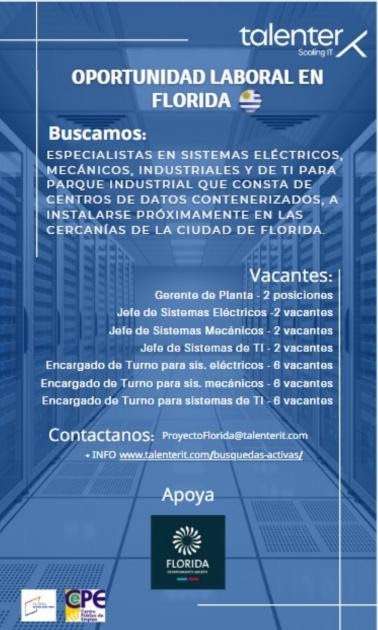 En el marco de las políticas de apoyo y fomento a emprendimientos que generen fuentes laborales para el departamento, la Intendencia de Florida, a través de la dirección de Desarrollo Sostenible y el CEPE ponen en conocimiento de interesados los detalles de un llamado para oportunidades laborales en parques industriales y centros de datos que se instalarán próximamente en el departamento.