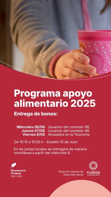 La Intendencia de Florida, a través de la Dirección General de Desarrollo Social y la Dirección General de Hacienda, informó que entre el 6 y el 8 de agosto se efectuará la entrega de los bonos correspondientes al Programa de Apoyo Alimentario 2025.