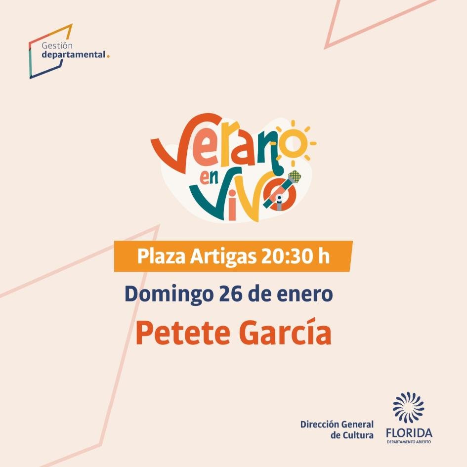 La Dirección General de Cultura de la Intendencia de Florida invita a disfrutar de una velada especial con Petete García, quien presentará su espectáculo musical este domingo 26 de enero de 2025, a las 20:30 horas, en la Plaza Artigas de Florida.