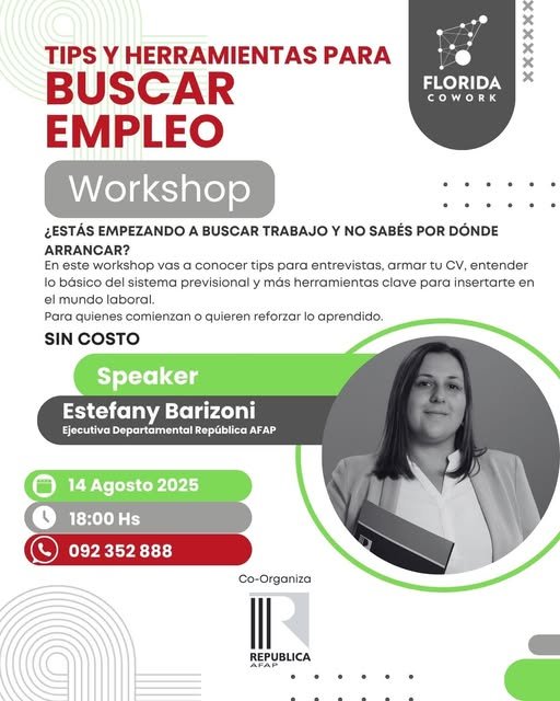 Este jueves 14 de agosto, a las 18:00 horas, se llevará a cabo en las instalaciones de Florida Cowork el quinto workshop del año, bajo el título “Tips y Herramientas para Buscar Empleo”. La propuesta apunta a brindar a los participantes estrategias y recursos para afrontar con mayor seguridad entrevistas de trabajo, preparar un currículum atractivo y comprender aspectos clave del proceso de inserción laboral.