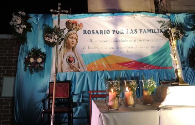 La jornada inició con la exposición del Santísimo, presentado en un altar especialmente preparado y decorado frente a la iglesia. Allí se rezó el Rosario por las Familias, guiado por el párroco y animado por distintos grupos de la comunidad: un matrimonio, los niños, los jóvenes, los abuelos y una familia local.
