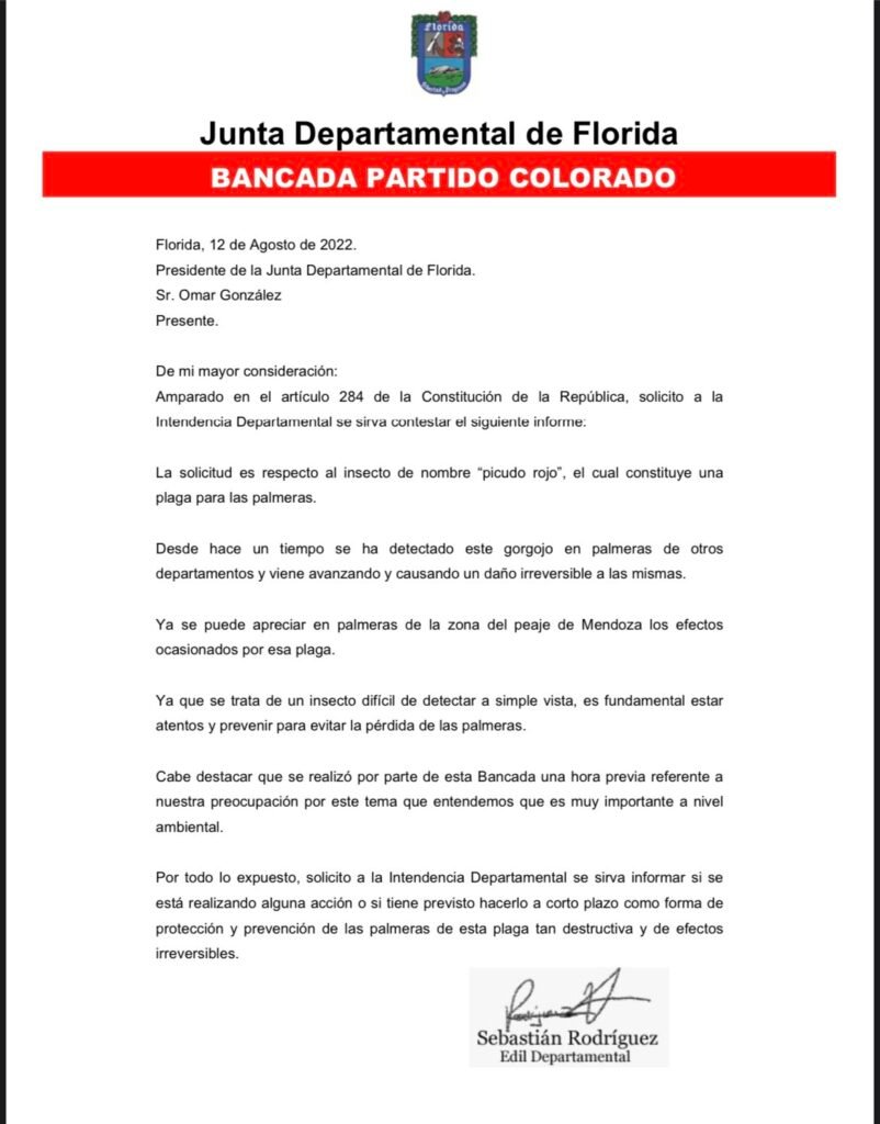 El insecto ha liquidado varios centenares de palmeras en la zona sur del país y esta afectando a nuestro Depto. en donde ya desde hace más de un año se puede visualizar la mortandad de palmeras que son parte del ornato público. Debemos tomar medidas para evitar la propagación.