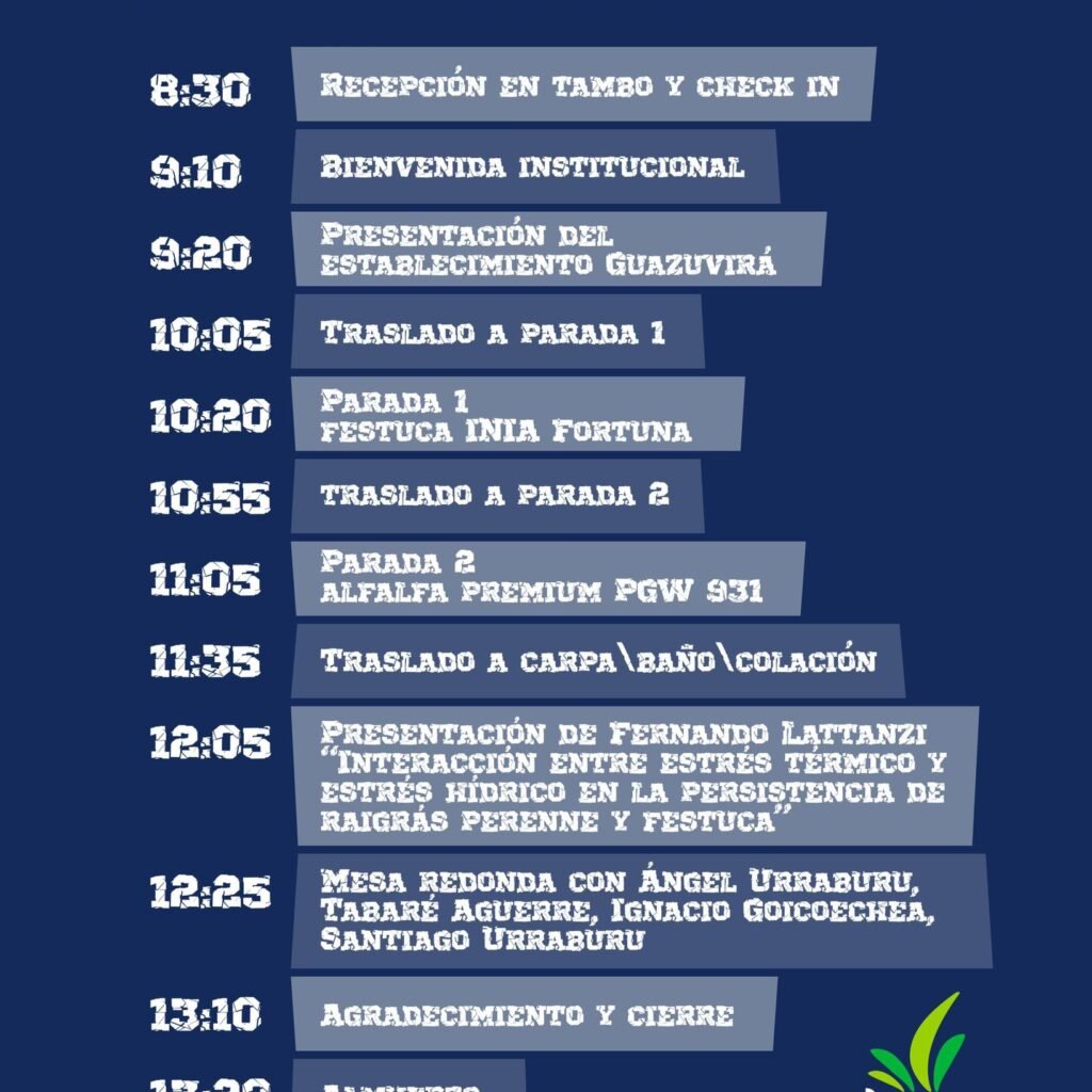 El encuentro comenzará a las 8:30 horas con la recepción y check-in de los participantes en el establecimiento de Guazuvirá. La jornada incluirá presentaciones institucionales, visitas a distintas paradas donde se analizarán variedades como Festuca, alfalfa Premium PGW931 e INIA Fortuna, y demostraciones de manejo de pasturas y estrategias de riego.